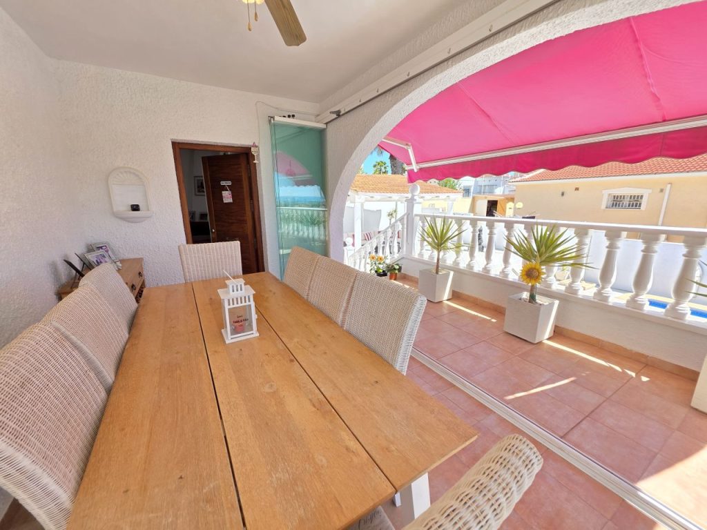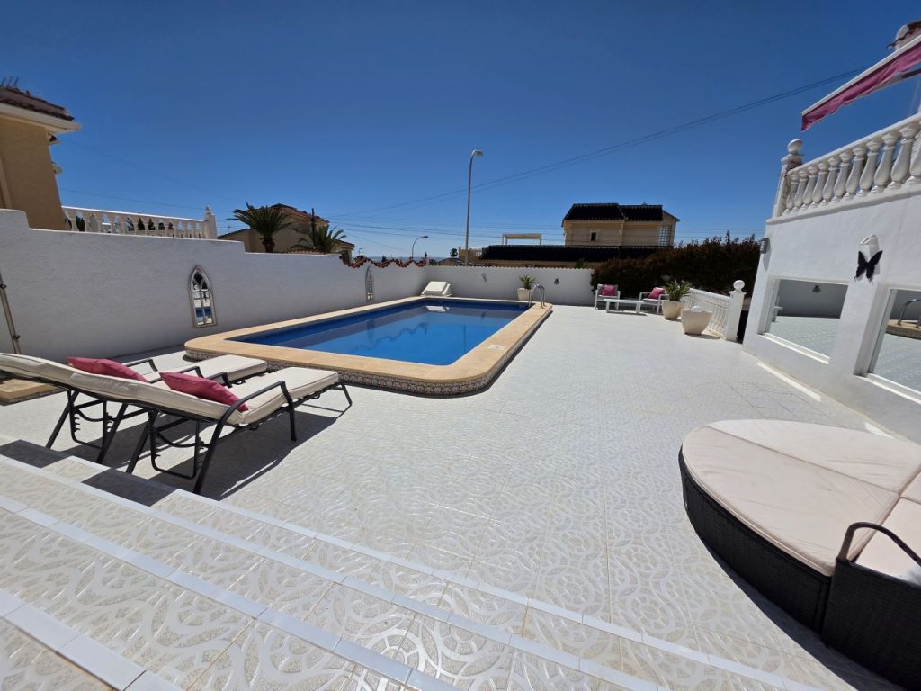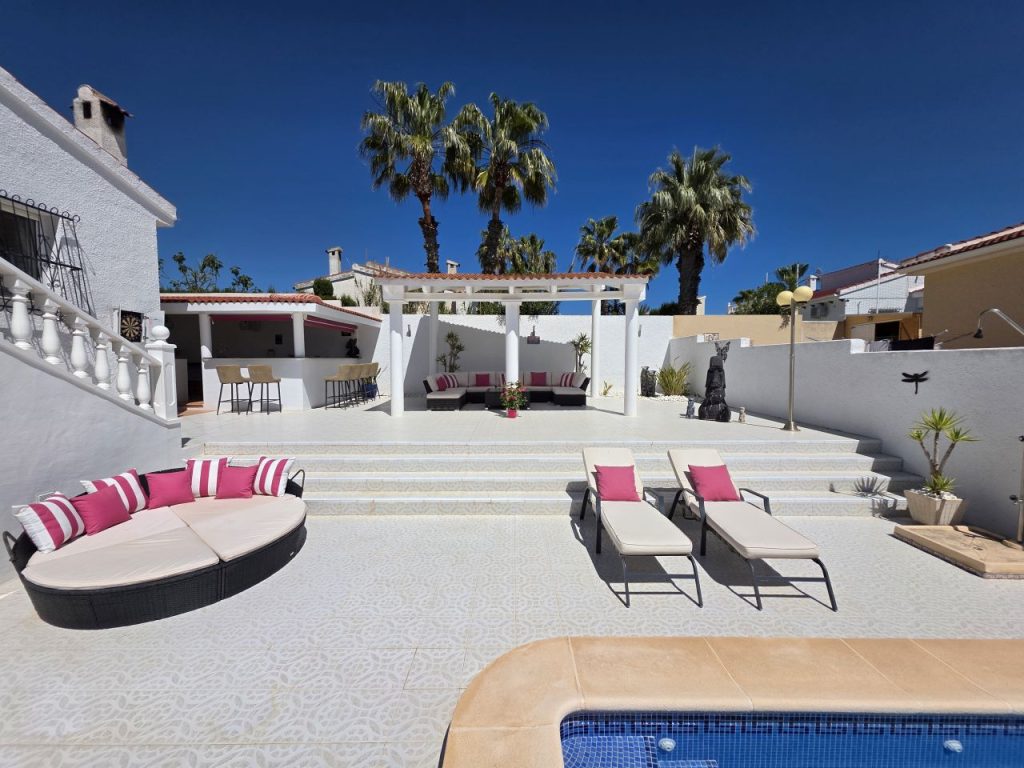 This villa comprises of 4 bedrooms, two of which are seprate from the mainhouse and have their own showerrrooms. The house comes with a large summerkitchen and covered terrace from which you can enjoy the salt lake views or la mata lake views. The villa is located in the heart of Ciudad Quesada and only minutes away from all amenities.